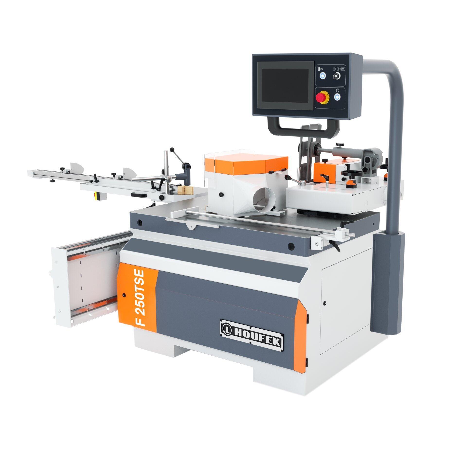 F 250 TSE je nejvyspělejší model spodní frézky s elektrovřetenem o výkonu 7,5 kW, bočním čepovacím vozíkem a pokročilým NC řízením. Nabízí motorizovaný zdvih a naklápění vřetena v rozsahu -90° až +45°, plynulou regulaci otáček v rozmezí 1500–12000 ot./min a upínací systém HSK 63F pro maximální rychlost a přesnost. Díky dotykovému ovládacímu panelu s automatickým najížděním všech parametrů a velkému hoblovanému pracovnímu stolu (1300 × 900 mm) je ideální pro náročné truhlářské provozy zaměřené na efektivitu a precizní výsledky.