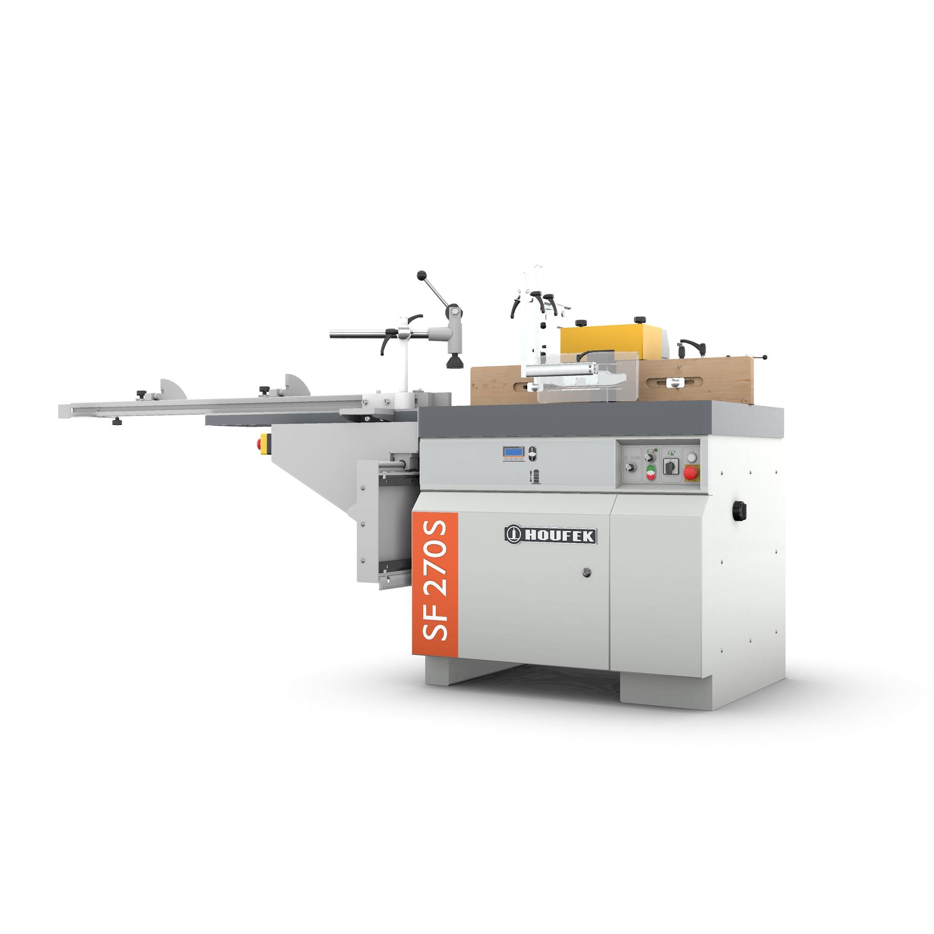 SF 270S je vyspělý model spodní frézky s pevnou hřídelí Ø 30 mm a motorem 5,5 kW, určený pro náročné profesionální použití. Ve standardní výbavě nabízí boční čepovací vozík s pevnou deskou a otočným pravítkem ±45° včetně upínacího excentru, díky čemuž je ideální pro čepování a přesné vedení obrobku. Otáčky vřetena jsou plynule nastavitelné od 1500 do 8000 ot/min pomocí frekvenčního měniče. Stroj disponuje elektrickým zdvihem vřetena s elektronickým ukazatelem výšky, zpětným chodem motoru a odklápěcím profilovacím krytem s číselníkovým nastavením. Standardní pracovní stůl má rozměry 1000 × 720 mm a umožňuje použití nástrojů do Ø 270 mm. SF 270S je navržen pro maximální přesnost, flexibilitu a komfort při práci.
